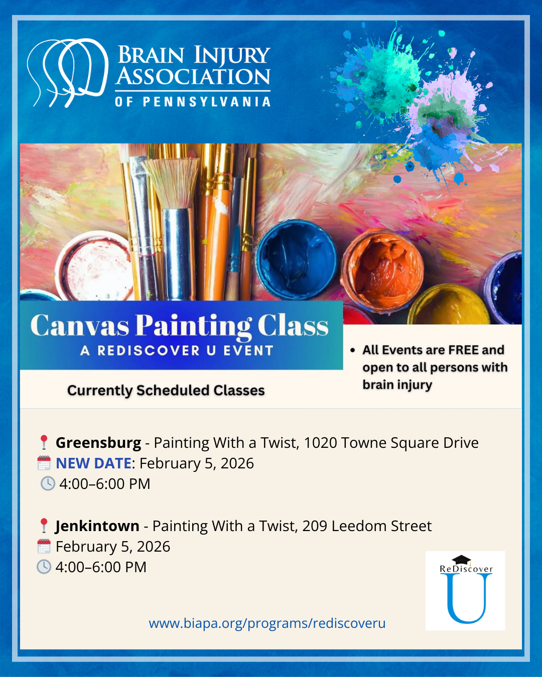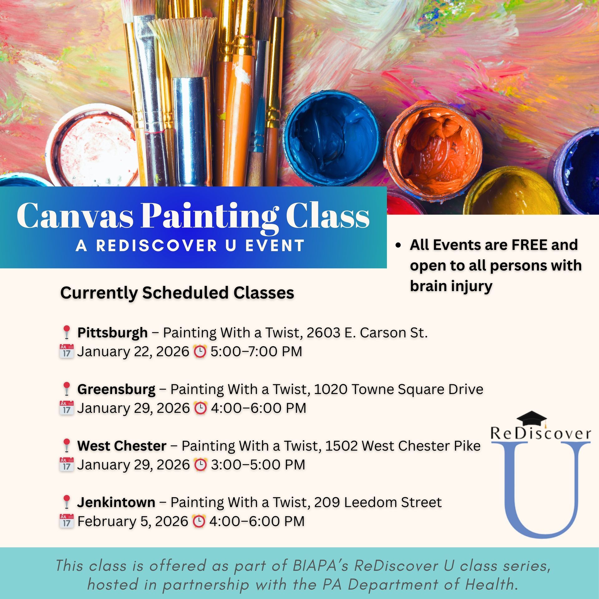 Beat the winter blues and get creative with us! ReDiscover U invites all persons with brain injury to join a FREE guided canvas painting class at local