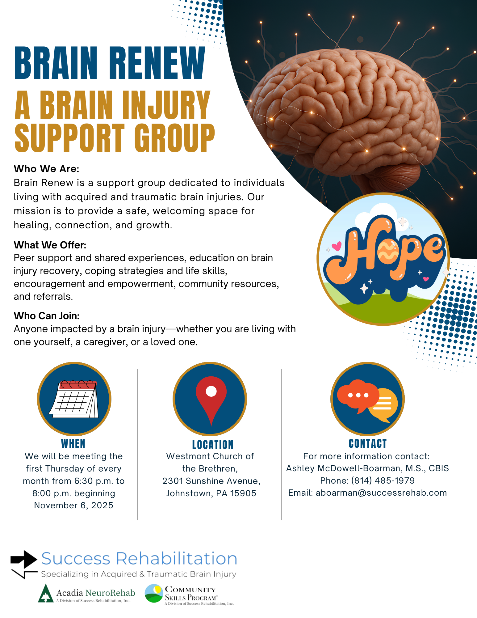 Format: Monthly meetings held via Zoom. For additional details on the Zoom meeting, including a link to the meeting, please contact either Caitie Chovans - CChovanes@successrehab.com or Karen Rosenberger - KRosenberger@successrehab.com.